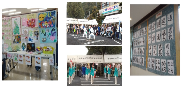 絵画、習字、版画、パッチワークなどの数々の力作が並びました。広場のほうでは、