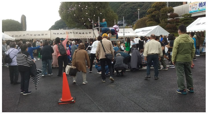 地域の中学生が長時間の司会進行を行い、お祭りも無事に終わりました。プログラム最後の餅まきでは、子供さんからご高齢の方々まで袋を準備して、餅まきを待たれていました。元気な掛け声が柚木地域に広がり、広場いっぱいにまかれていました。