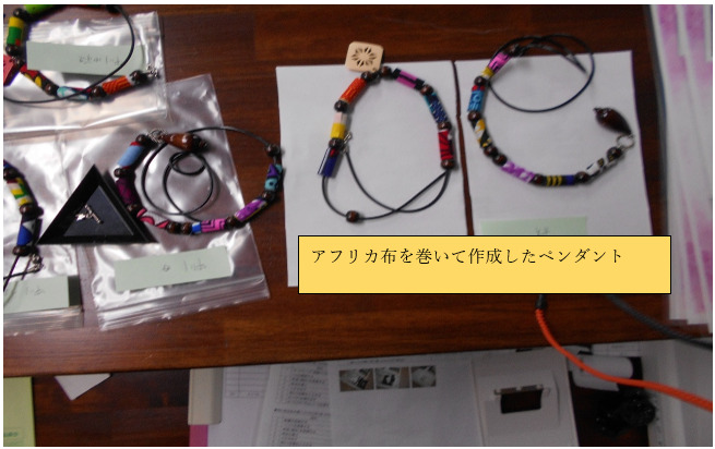 アクセサリー(ペンダント)となると、目の色を変え、自分の好きなアフリカ布を6枚探して、小さな筒状の紙に布を巻きつけていきました。そしてオリジナルペンダントの出来上がりです。