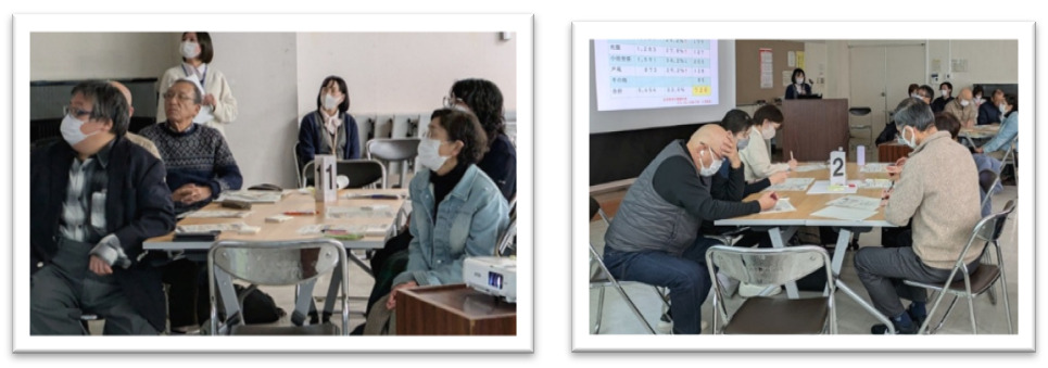 自治会長、民生委員児童委員、薬剤師、歯科医師、管理栄養士、医療ソーシャルワーカー、看護学校教員、訪問看護事業所職員、介護福祉士、シニア脳トレインストラクター、生活支援サポーター、有償生活支援団体職員、他地区生活支援コーディネーター、包括職員の合計48名の参加にて開催。
